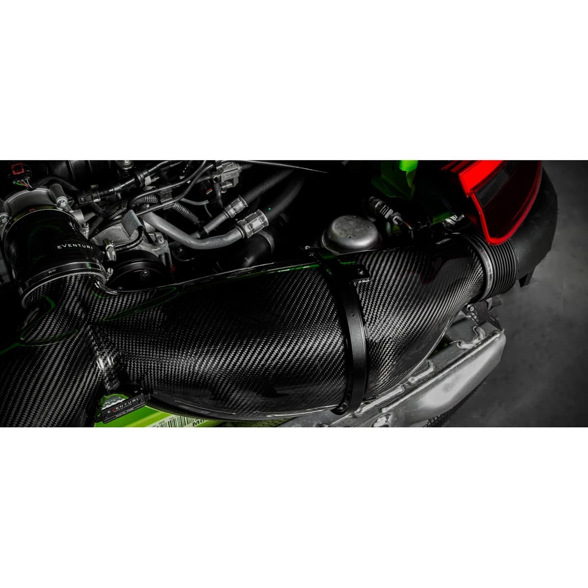 Porsche GT3 RS indsugning er designet til at tilbyde en mere effektiv luftstrøm til motoren sammenlignet med OEM-luftboxen. Ved at bruge deres patenterede Venturi Housing-koncept, kan luften passere gennem filtrene med en langt mindre kringlet vej, hvilket reducerer systemets modstand. Desuden er den samlede volumen i indsugningen øget, hvilket forbedrer maksimal flowkapacitet. Med specialfremstillede filtre med en yderdiameter på 192 mm eller 7,5" og en filtreringsflade på over 110.000 mm^2 pr. filter, har Eventuri udnyttet den tilgængelige plads maksimalt. Indsugningstemperaturen er også reduceret ved at sikre et lukket system og anvende kulfiber, som har en lav termisk ledningsevne. Resultatet er reelle performance-gevinster og mærkbar forbedring af gasrespons.