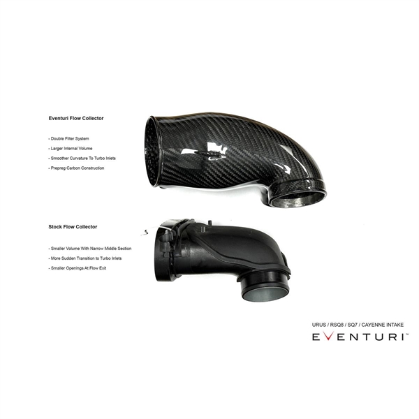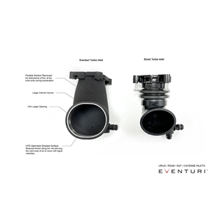 Den største begrænsning i det originale system er turboindsugningerne. De originale indsugninger er ikke blot små i størrelse, men de har også 2 fleksible sektioner. Den fleksible sektion lige foran turboen skaber turbulens, når motoren bevæger sig under acceleration. For at modvirke dette har de originale indsugninger også flow-guider ved udgangen, men disse skaber ligeledes en begrænsning. Eventuri fjernede den første fleksible sektion, hvilket betød, at Eventuri kunne øge det indvendige volumen. Ved at øge indsugningens størrelse kan turboerne trække luft ind med mindre modstand, hvilket giver hurtigere spool. På de følgende billeder kan du se forskellene i størrelserne.