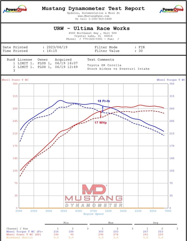 deres GR Corolla indsugning er uafhængigt testet af forskellige anerkendte tunere. Det første dynodiagram er fra Limit1 i USA. Flere forsøg blev udført med OEM luftfilterboksen for at opnå et gentageligt resultat og derefter igen med Eventuri indsugningen. Testene blev udført samme dag efter hinanden. Resultaterne viser en stigning i moment og effekt over hele omdrejningsområdet – ikke kun ved topomdrejninger, hvilket er grunden til, at bilen føles mere responsiv og kan accelerere hurtigere gennem gearene.