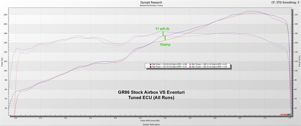 Nedenfor er et dynodiagram af en fuldstændig standard GR86, hvor kun luftboksen er udskiftet med Eventuri-indtaget. Dette blev testet uafhængigt hos DREAM Automotive. Flere kørsler blev udført med OEM-luftboksen for at opnå et gentageligt resultat og derefter igen med Eventuri-indtaget. Testene blev udført samme dag efter hinanden. Resultaterne viser en stigning i topmoment og effekt med et "resonans" fald mellem 5700-6300 o/min, hvorefter effektgevinsten udgør 14 hk, når kurven krydser standardlinjen og fortsætter til omdrejningstallets grænse.