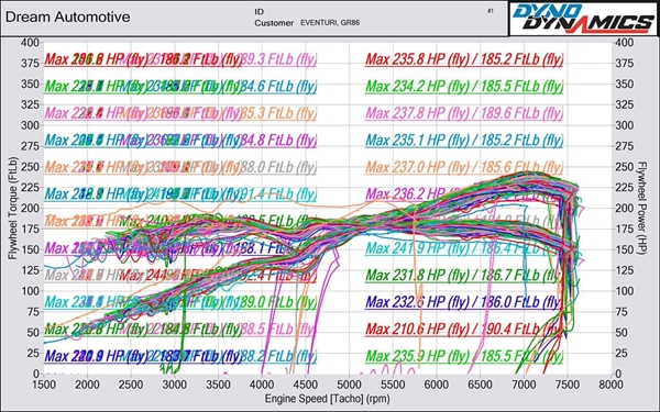 Nedenfor er et dynodiagram af en GR86, som er specialtuned af Paragon Performance i USA. De tunede bilen til E85 med lukket brændstofkontrol for at sikre identisk brændstoftilførsel på både standardindtaget og Eventuri, og fjerne variabiliteten fra GR86’s åbne brændstofstyring. Paragon justerede også ECU’en for at eliminere resonansproblemet, og resultaterne taler for sig selv. Alle kørsler blev udført med samme tune, og kun luftboksen blev ændret mellem kørslerne. Testene blev udført samme dag efter hinanden.