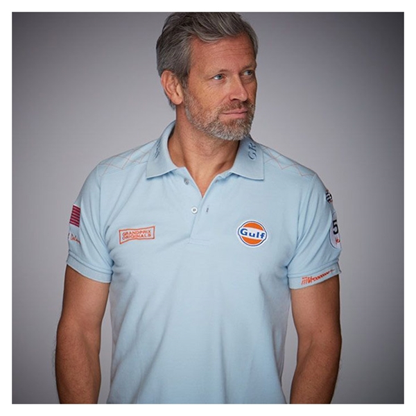 Den Delaney Polo i Gulf Blue kombinerer simpelthen det bedste fra motorsport og hylder Steve McQueen, hvis navn var Michael Delaney i den berømte roadmovie Le Mans. De farvede kontrastsømme i skulderområdet minder om hans køredragt.