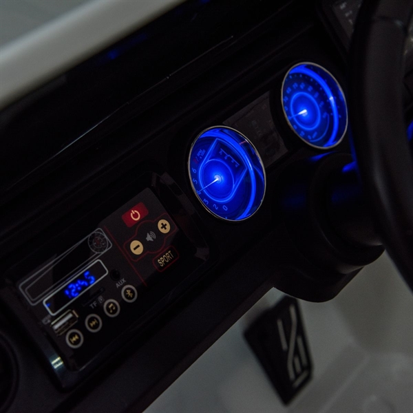 Bilen er designet med realistiske detaljer, herunder lædersæde, åbne/lukke-døre, sidespejle, LED-lys foran og bagpå samt et elektronisk instrumentpanel med musikafspiller og USB, AUX og SD-indgange. Den trevejede nøglestart gør det muligt at tænde lysene og starte bilen på en autentisk måde, mens motorlyd ved opstart og elektrisk horn fuldender oplevelsen.