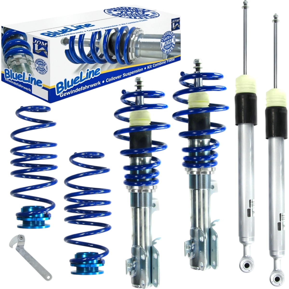 Denne gevindundervogn kommer fra et stort Tysk firma, JOM Blueline, som er en tysk tuningspecialist, med base i Bochum Tyskland. Blueline gevindundervogne er med galvaniseret fjederben, og blå fjedre. Gevindundervognen kan højdejusteres fra 20 mm til 85 mm – for de nøjagtige detaljer omkring lige nøjagtigt din Mazda 2, se da beskrivelsen længere oppe.