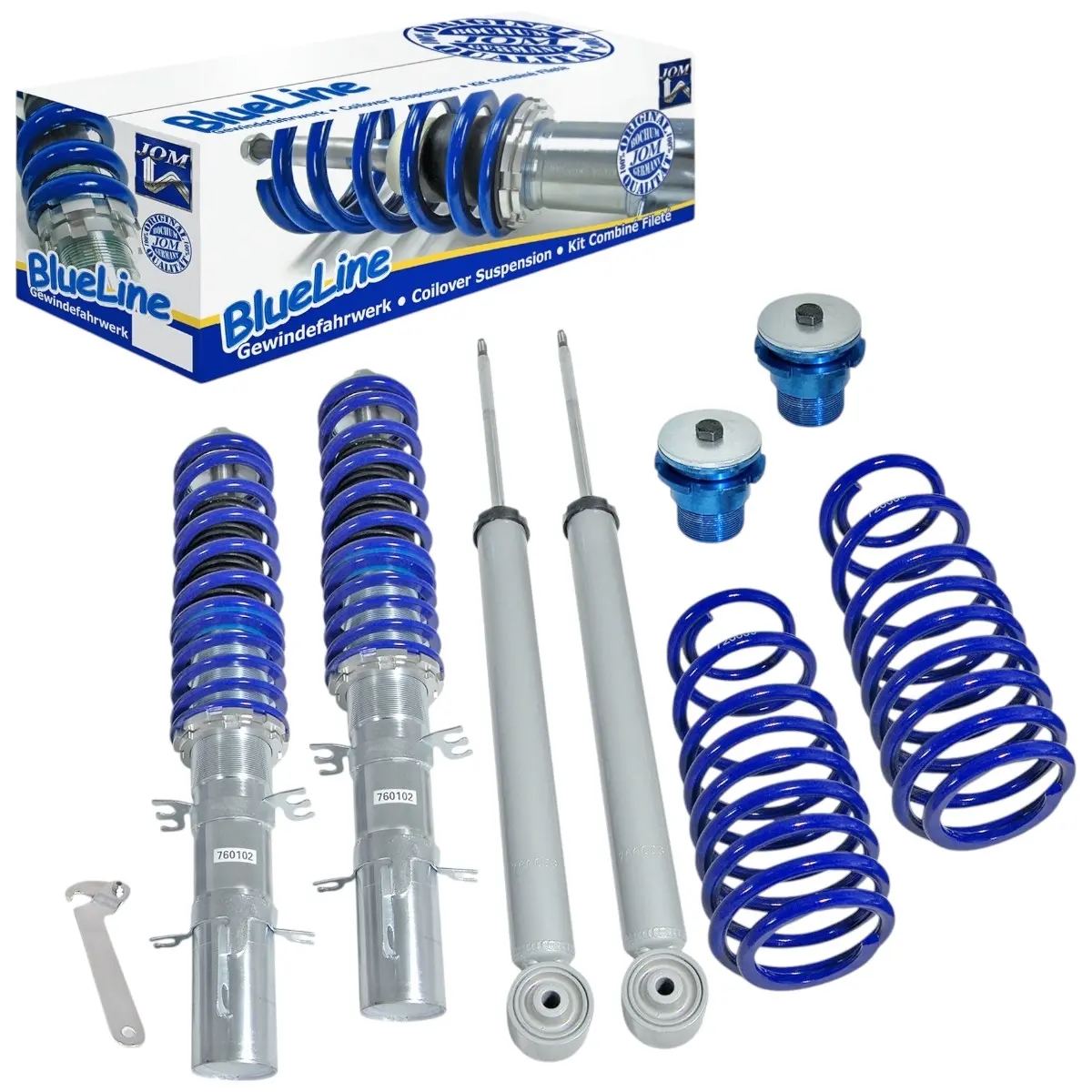 Denne gevindundervogn kommer fra et stort Tysk firma, JOM Blueline, som er en tysk tuningspecialist, med base i Bochum Tyskland. Blueline gevindundervogne er med galvaniseret fjederben, og blå fjedre. Gevindundervognen kan højdejusteres fra 20 mm til 85 mm – for de nøjagtige detaljer omkring lige nøjagtigt din VW New Beetle, se da beskrivelsen længere oppe.