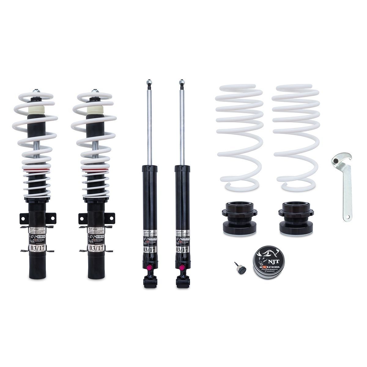 JOM NJT eXtrem er et sæt, der kombinerer markant sænkning med fuld justerbarhed, så du kan tilpasse både bilens højde og affjedring efter dine behov. Med NJT eXtrem kan du ændre affjedringens hårdhed, hvilket giver fleksibilitet fra komfortabel kørsel til en mere sportslig og dynamisk oplevelse.
