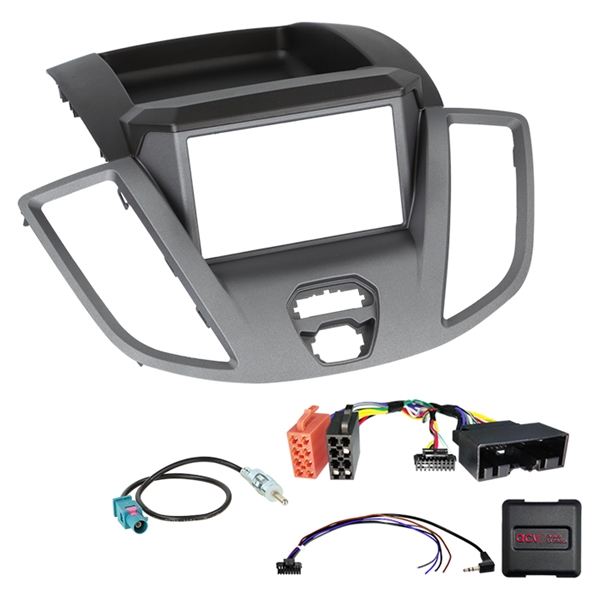 Indhold i pakken 2-DIN frontplade med opbevaringsrum til Ford Transit V363 2014-2019 (grå) SWC-interface/kabelføring til Ford (24-pin, uden display) med multilead (løse ledninger) Antenneadapter Fakra (han) til DIN (han), passiv
