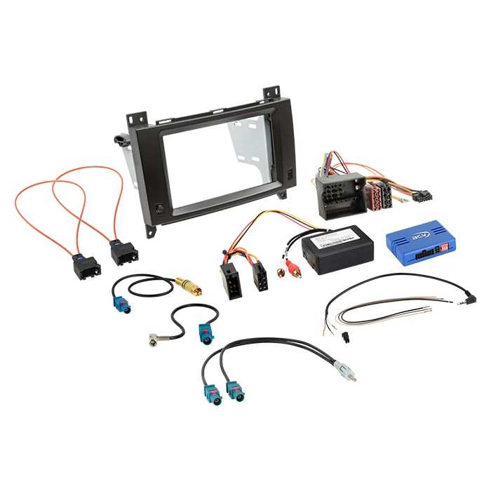 Dette komplette 2-DIN monteringskit gør det muligt at udskifte den originale Mercedes-hovedenhed med en eftermarkeds 2-DIN radio i udvalgte Mercedes-modeller. Sættet indeholder faciaplade (sort) samt tilslutningskit med CAN-Bus interface og ratfjernbetjeningssupport (SWC), så du får en mere integreret og OEM-lignende installation.