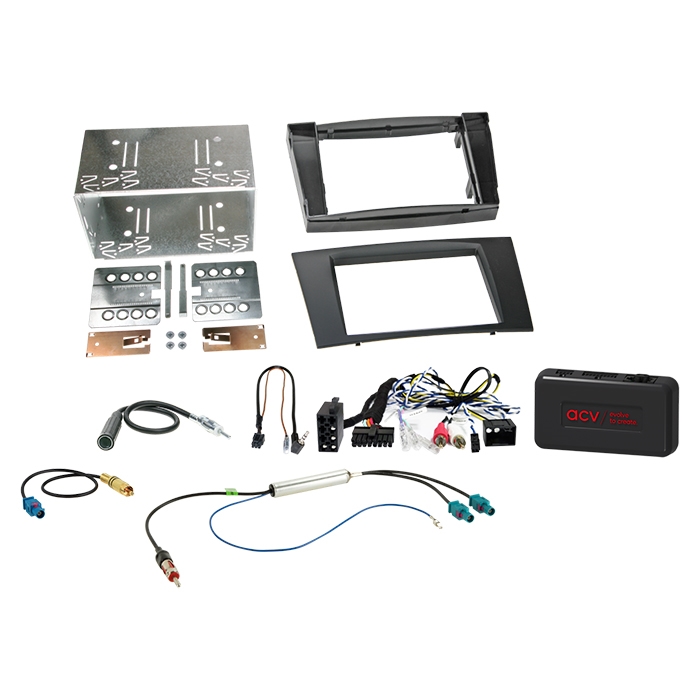 Dette komplette 2-DIN monteringskit gør det muligt at eftermontere en 2-DIN aftermarket radio i Mercedes CLS (C219) og Mercedes E-Klasse (W211). Sættet inkluderer 2-DIN facia/radioramme samt HU-tilslutningskit med CAN-bus interface til ratbetjening (SWC) og integration til OEM-forstærket lydsystem.