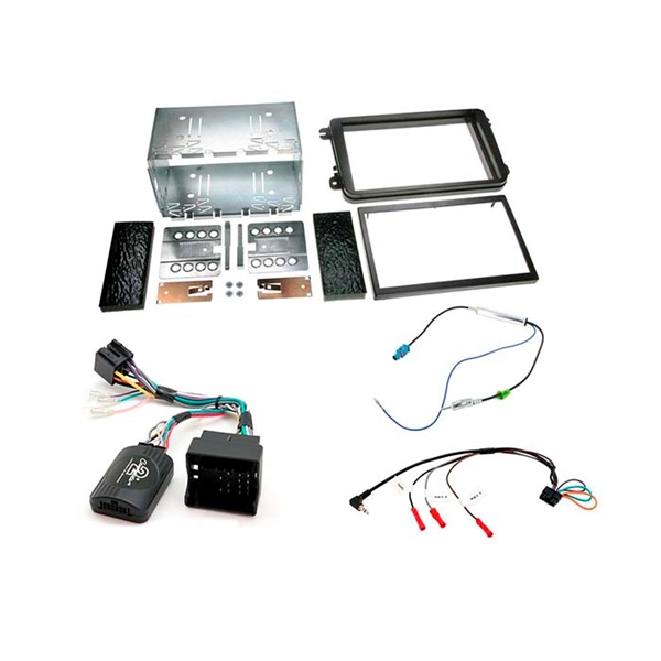 Sættet leveres med en 2-DIN radioramme i farven sort, CAN-Bus interface til ratbetjening, Fakra antenne adapter og et universelt patch kabel (CTMULTILEAD.2).
