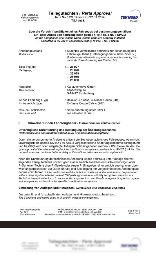 Der medfølger normalvis en forenklet TÜV-godkendelse, når du bestiller en gevindundervogn, et sænkningssæt eller en sportsundervogn.