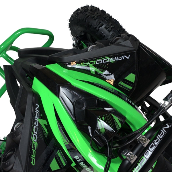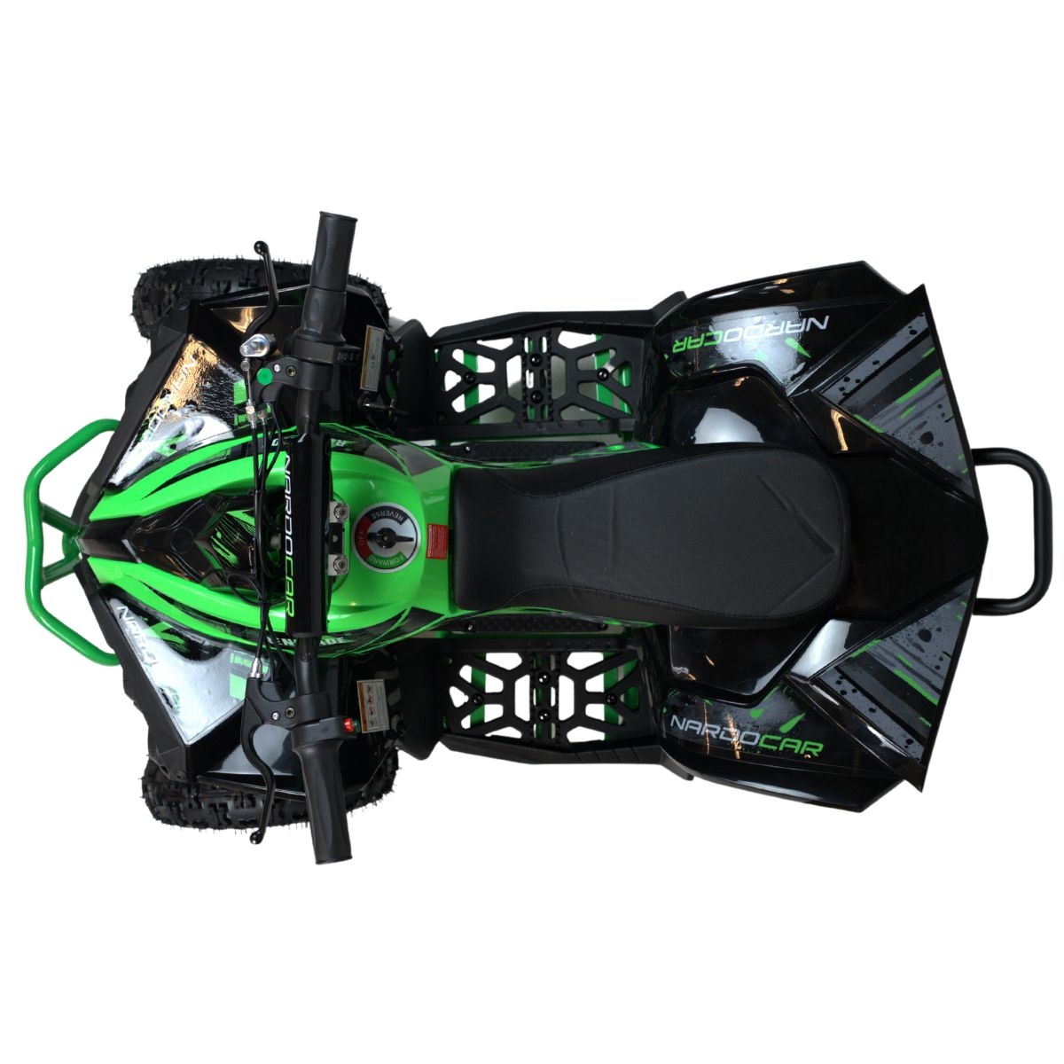 ATV'en er en fartmaskine, der vejer 55 kg og når høje hastigheder for en kraftfuld el-ATV-oplevelse. ATV'en er konstrueret med en metalramme og et dobbelt ledningsbremsesystem, der sikrer en stabil og funktionsdygtig bremse i alle terræner og vejrforhold. En kvalitet, du aldrig før har oplevet i en elektrisk ATV.