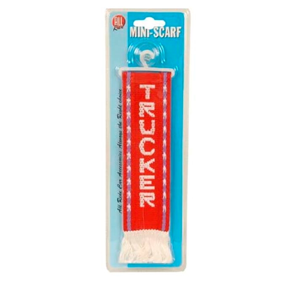 Mini tørklæde til udsmykning af forruden i bilen, i rød og hvid med teksten "Trucker"
