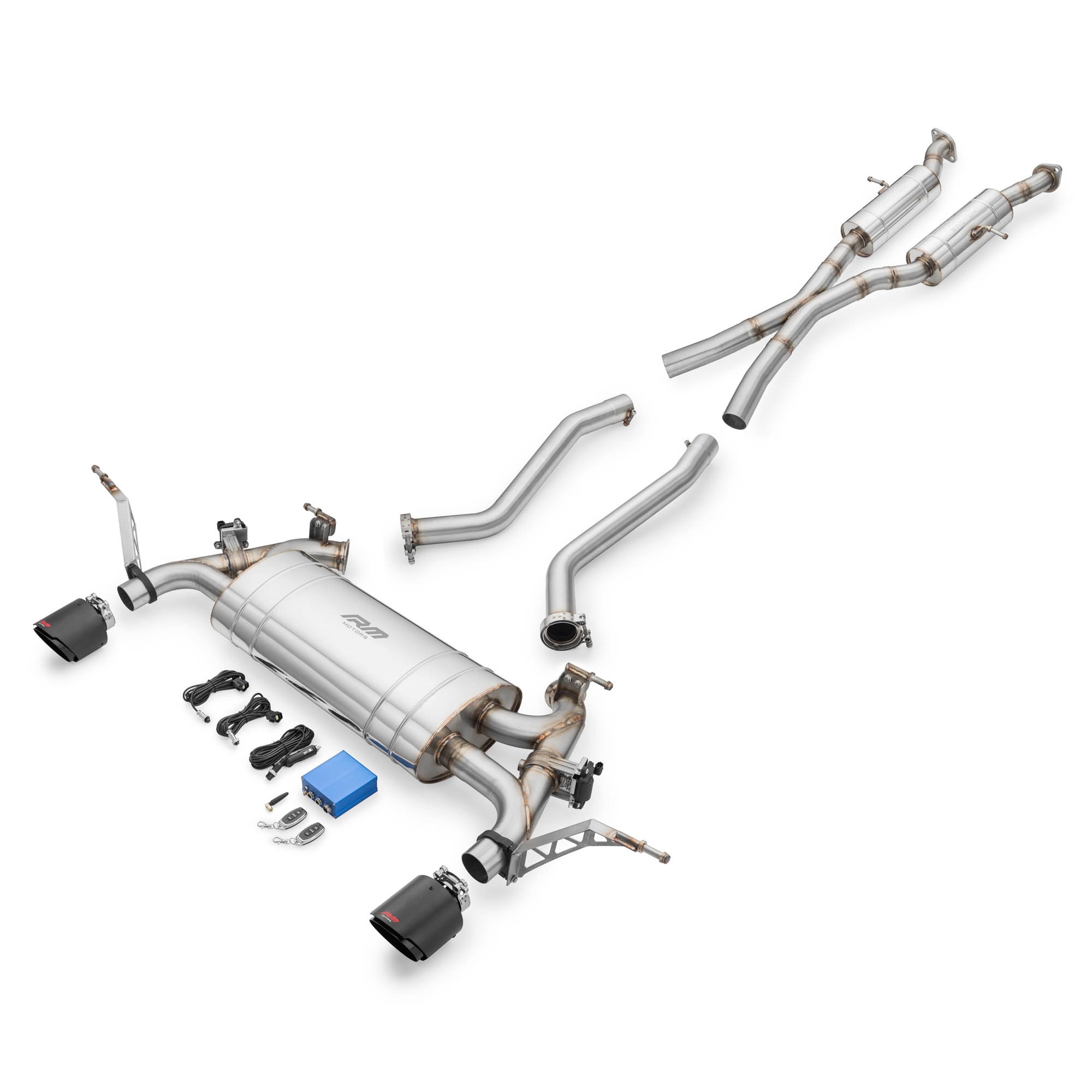 • Choice of RM Motors logo exhaust tips with 114 mm / 4" outlet diameter.