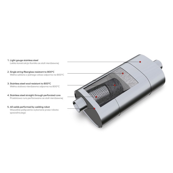 A silencer with a straight-through construction, damped with stainless steel wool and a glass mat resistant to 800 degrees Celsius (glass mat made of full hair - we do not use scraps). Fully welded by welding robot, hand finished. Each element of the product is made using CNC technology. Crack-resistant embossed bottoms have been used.