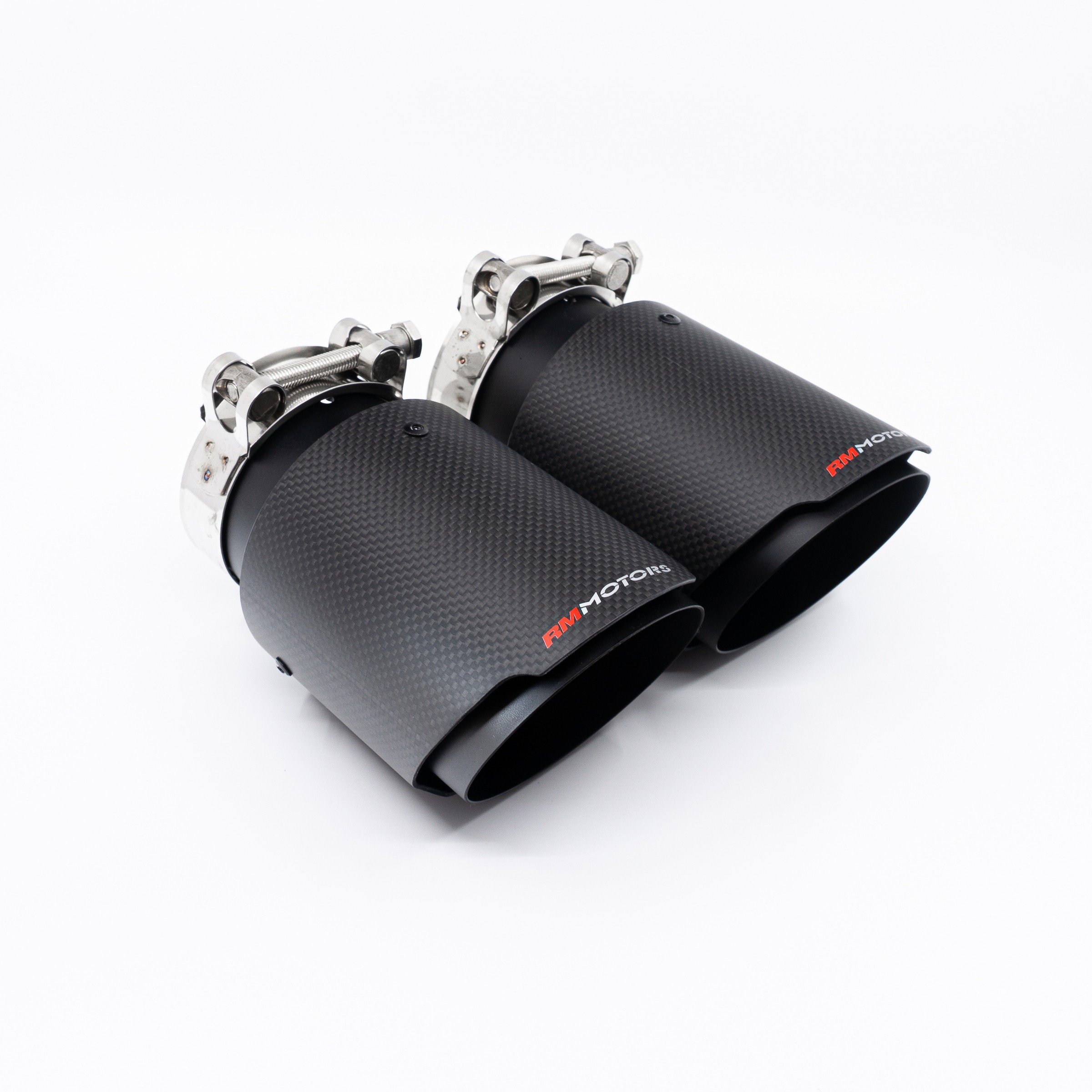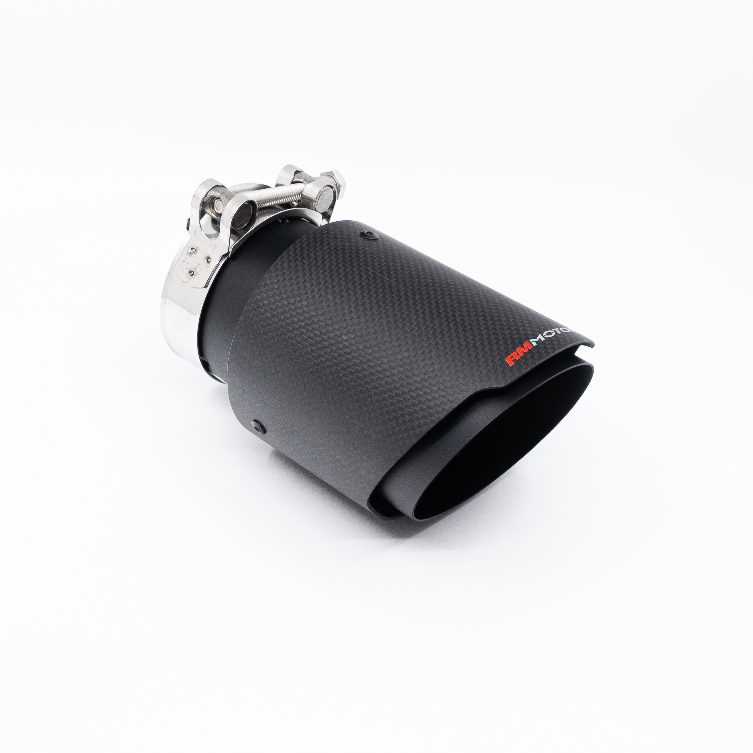 Carbon fiber exhaust tip and high-quality stainless steel (T304). The inlet clamp allows for easy installation without drilling or welding. Easy position adjustment after installation. The product has 12 months warranty.