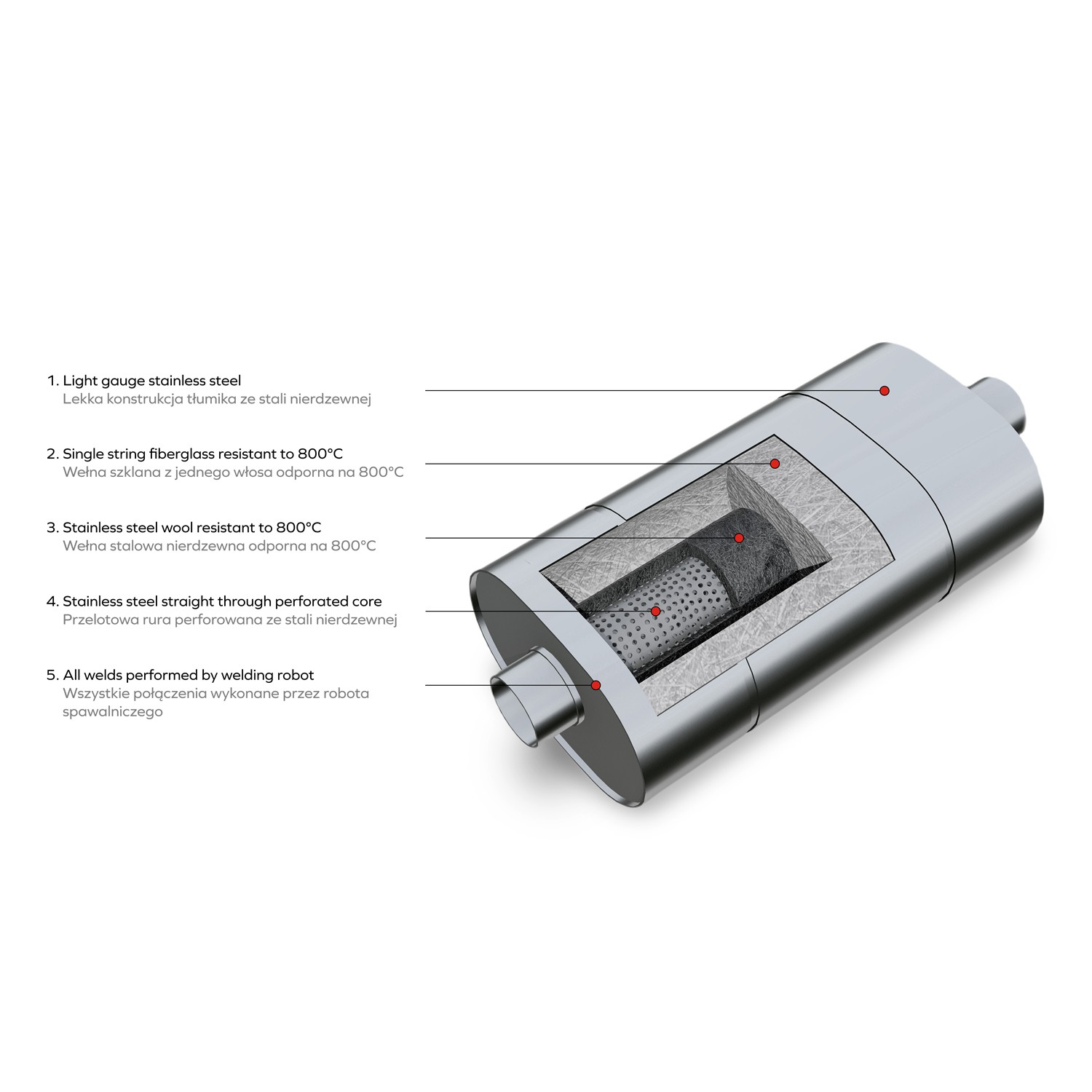 Universal passage silencer made of stainless steel.