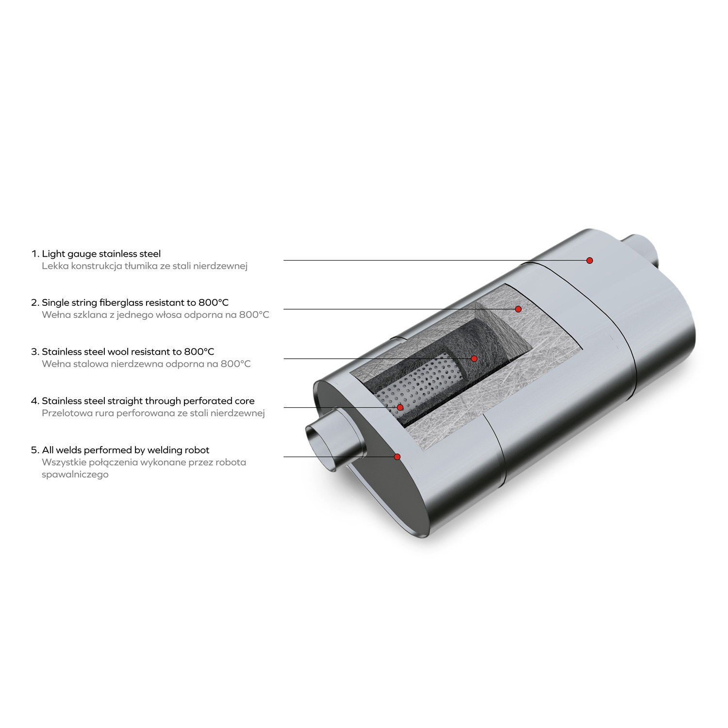 Universal passage silencer made of stainless steel.