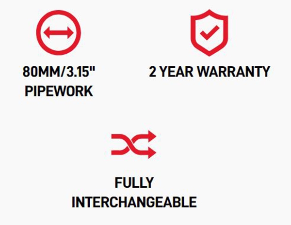 Turboladede motorer skal kunne ånde. For at hjælpe dette er der udviklet en række turbo-nedløbsrør, der passer til højdrevne turboapplikationer. For at muliggøre en stigning i ydeevnen matcher Scorpion rørdiametrene for de højeste ydeevnegevinster.