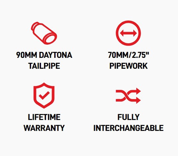 Vores erfarne teknikere har udviklet et 70mm/2,75” ikke-resoneret, ventileret GPF-back system. Vi tilbyder et udvalg af udstødningsrørsstilarter og finish, du har mulighed for quad 90mm poleret Daytona, sort keramisk Daytona, poleret STW eller OE tilpasning udstødningsrør, som passer til det indbyggede fabriksudstødningsrør for et mere strømlinet udseende.