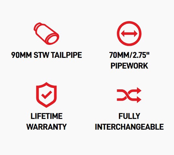 Vores erfarne teknikere har udviklet et 70mm/2,75” ikke-resoneret, ventileret GPF-back system. Vi tilbyder et udvalg af udstødningsrørsstilarter og finish, du har mulighed for quad 90mm poleret Daytona, sort keramisk Daytona, poleret STW eller OE tilpasning udstødningsrør, som passer til det indbyggede fabriksudstødningsrør for et mere strømlinet udseende.