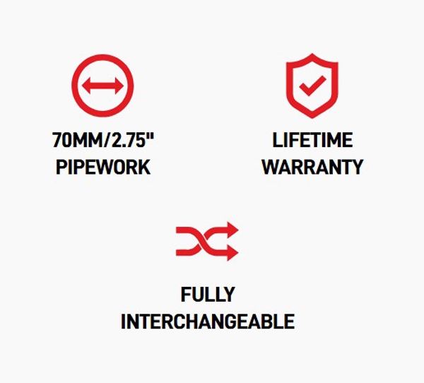 Derudover forbedrer den store 89,9mm/3,5” rørdiameter turbo-spooling og leverer en buldrende udstødningslyd som ingen anden.