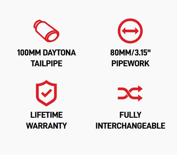 Daytona: Dette design kræver ingen introduktion, den klassiske Scorpion Daytona slash-cut stil med et moderne twist på et tidløst udseende. Daytona er et flot valg til alt fra hot hatchbacks til flagkship autobahn-sedans.