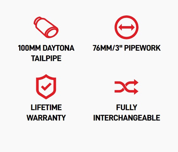 Disse udstødninger fås i to muligheder: resonated (udstyret med en center-silencer for at reducere drone og give en mere raffineret lyd) eller non-resonated (som fjerner den oprindelige silencer for en højere lyd).