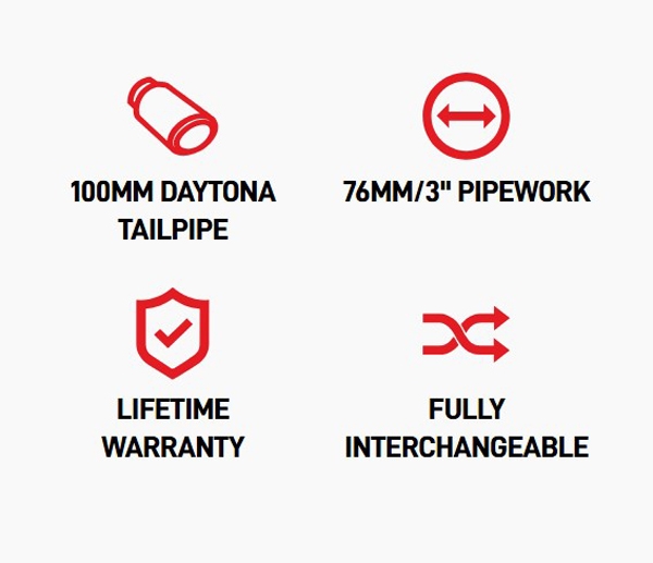 • Valg af dobbelt polerede/sorte keramiske Daytona, polerede STW, eller carbon Ascari tailpipes (Challenge er kun poleret STW)
