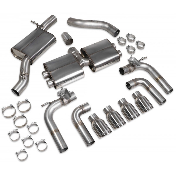 Udført i førsteklasses 80mm/3,14" T304 rustfrit stål, tillader det CNC-bøjede design med stor diameter en maksimal ydeevne ved at tillade en større gasstrømning. De tilgængelige muligheder er resonator med ventil, resonator uden ventil, ikke-resonator med ventil og ikke-resonator uden ventil. "Valved"-versionen bruger den originale motor og kan betjenes af føreren med "drive mode select"-knappen inde i bilen. Der er også en "non-valved" version, der fjerner ventilen helt for en kontinuerlig sporty lyd.