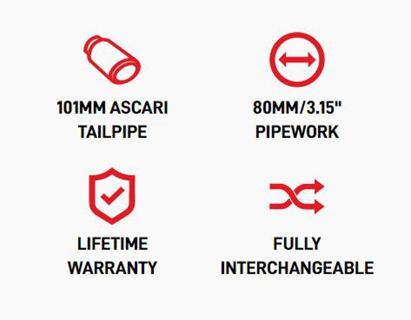 Fremstillet af førsteklasses 80 mm/3,14" T304 rustfrit stål giver det CNC-mandrel-bøjede design med stor diameter maksimal ydeevne ved at tillade en større strøm af gasser. De tilgængelige muligheder er resonant ventil, resonant uden ventil, ikke-resonant ventil og ikke-resonant uden ventil. Den ventilerede udgave bruger den originale motor og kan betjenes af føreren med knappen til valg af køretilstand inde i bilen. Der er også en ikke-ventileret version, der fjerner ventilen helt for en kontinuerlig mere sportslig lyd.