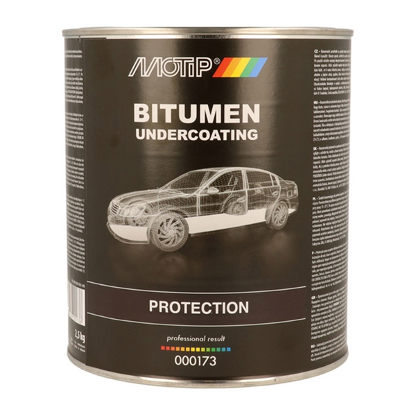Høj kvalitets konserveringsmiddel fra MoTip til behandling af køretøjers undervogn. Bitumenbaseret undervognsbeskyttelse er modstandsdygtig over for vejrpåvirkninger og svage syrer og baser og har en fremragende rustforebyggelse. Bitumenbaseret undervognsbeskyttelse forbliver fleksibel og er lydabsorberende. MoTip Bitumenbaseret undervognsbeskyttelse fås i en aerosol på 500 ml, en dåse på 1.000 ml til påføring med en UBC-sprøjtepistol og i penseldåser på 1.300 gram og 2.500 gram.