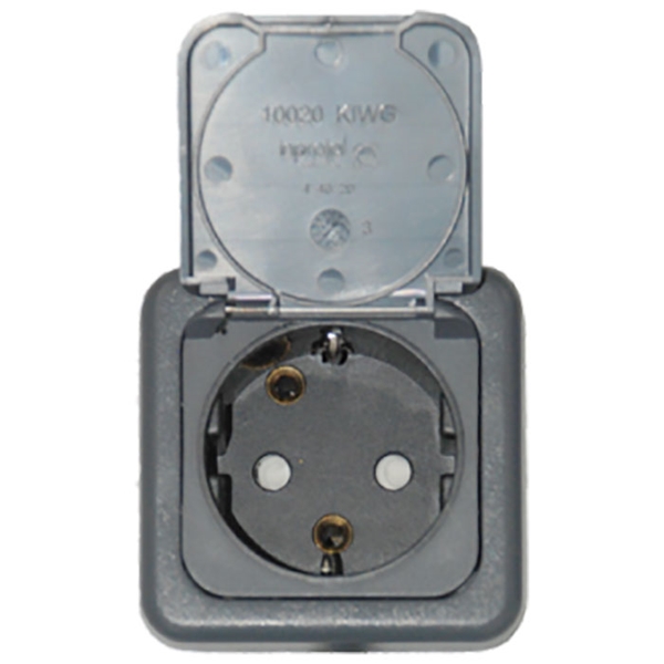 Gråt enkelt udtag for 230VAC, 16A, beregnet til indbygning og tilpasset DEFA PlugIn systemet. Dette enkle udtag er væsentlig mindre end vores andre udtag, beregnet til indfældning med fjederbelastet låg og som monteres ude men under tag. IP44.