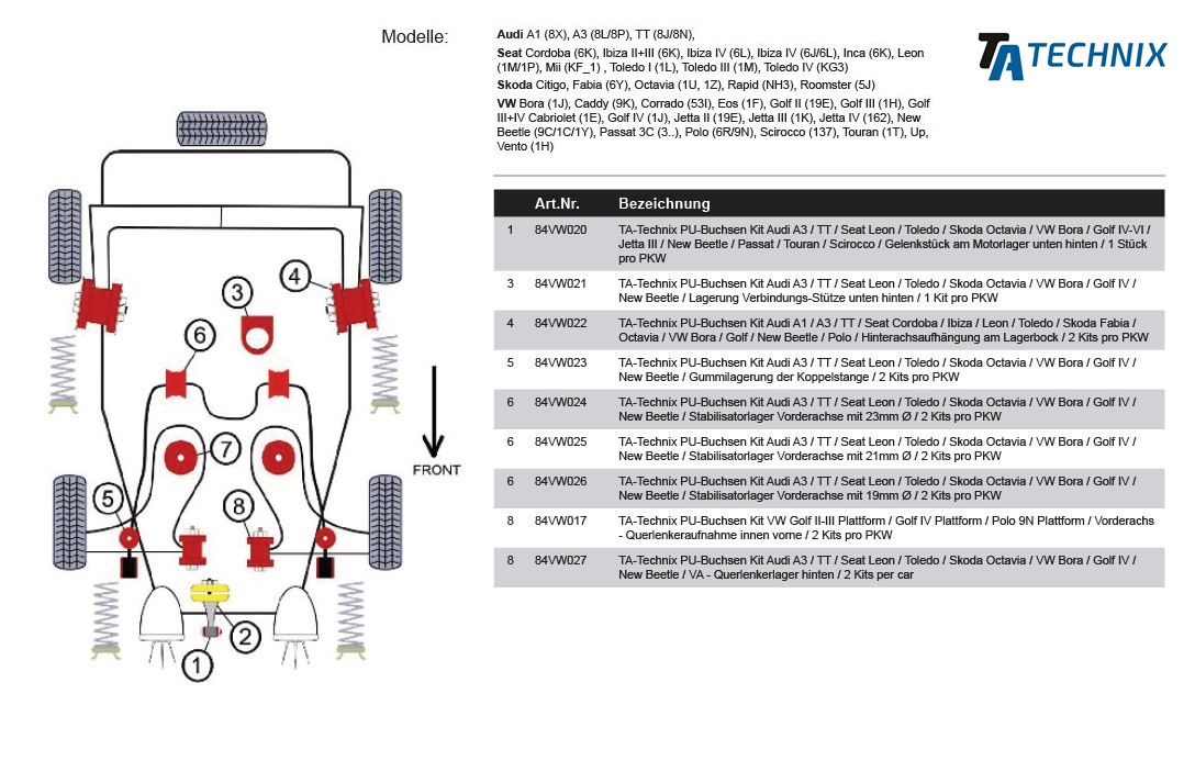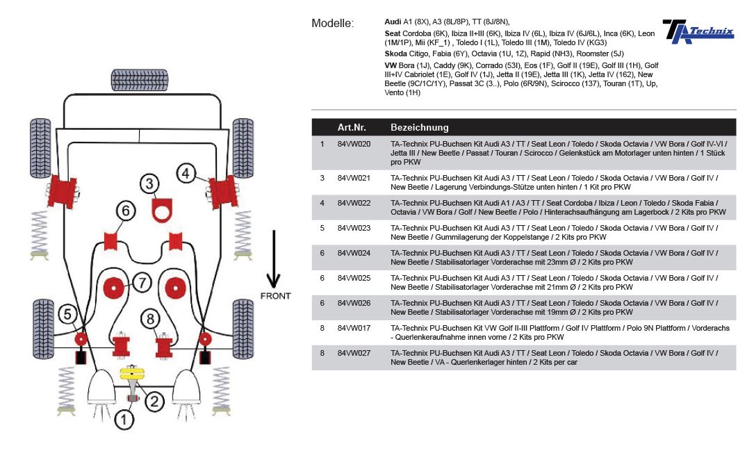 PU-bøsninger fra TA Technix er lavet af slidstærkt polyurethan og erstatter de originale gummibøsninger i ophænget. De giver mere præcis styring og mindre deformation under belastning – ideelt til både sport og vejbrug.