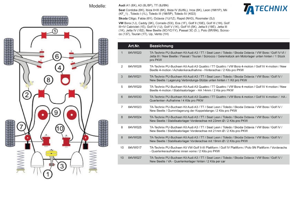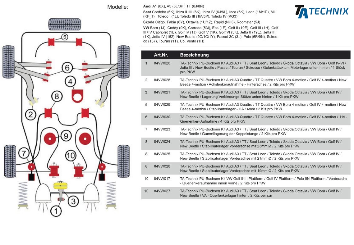 PU-bøsninger fra TA Technix er lavet af holdbart polyurethan og erstatter de originale gummibøsninger i affjedringen. De giver mere præcis styring, reduceret deformation under belastning – ideelt til både sports- og gadebrug.