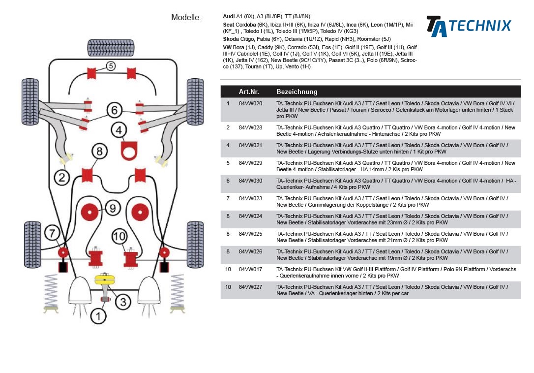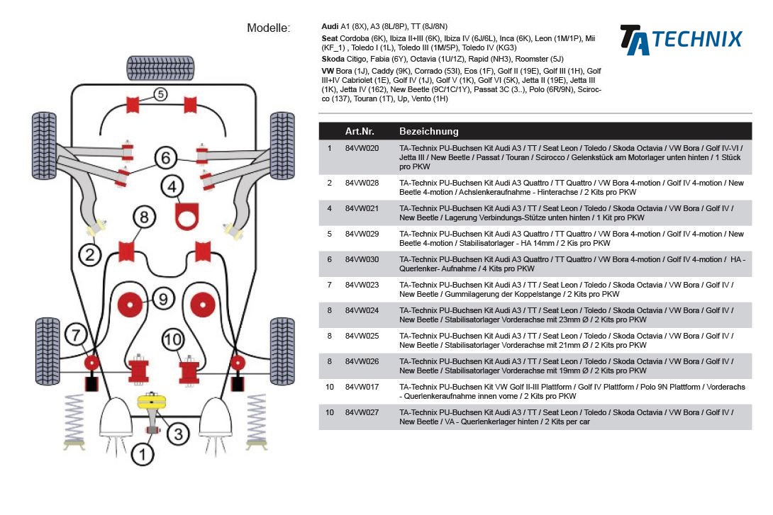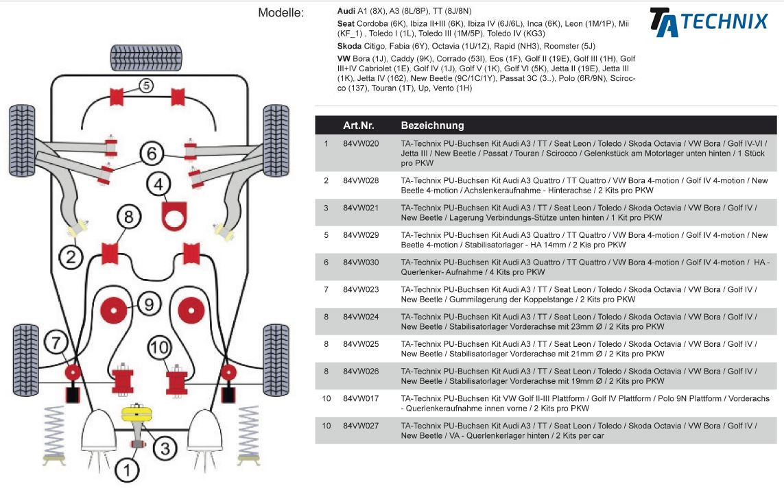 PU-bøsninger fra TA Technix er lavet af holdbart polyurethan og erstatter de originale gummibøsninger i affjedringen. De giver mere præcis styring, mindre deformation under belastning – ideelle til både sports- og gadebrug.