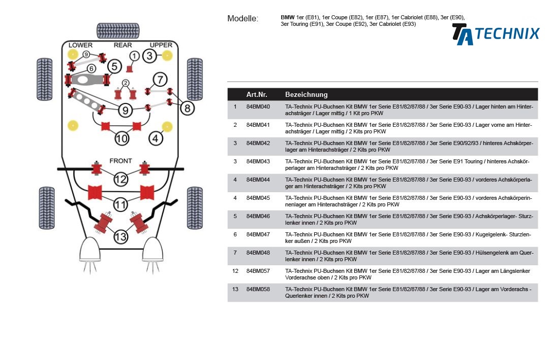 TA-Technix Polyurethan Bøsninger til BMW 3-Serie E90, E91, E92, E93. Polyurethan-bøsninger er et alternativ til udskiftning eller opgradering af bøsningerne i din bil. Du får en bedre holdbarhed end standard gummibøsninger og en bedre performance til din bil. Om TA Technix TA Technix er en tysk tuningspecialist, med base i Berlin, som har mere end 10 års erfaring fra tuningbranchen. TA Technix er særligt kendt for deres lave priser og den sporty stil, som de er i stand til at tilføre enhver bil. Sortimentet fra TA er kæmpestort og tæller, foruden sportsundervogne – som den du kigger på nu til Alfa 1300 – også stabilisatorstænger, gevindundervogne, tårnstivere og sænkningsfjedre. Passer også til: BMW 1er Series 3-doors (E81) / 1er Series 5-doors (E87) / 1er Series Coupe (E82) / 1er Series Cabriolet (E88) Only Dieselmodel with Automatic + Otto engine with manual gear/Automatic without M Only Dieselmodel with Automatic + Otto engine with manual gear/Automatic incl. iX model without M model BMW X1 Series (E84) Diesel + Petrol model with Automatic BMW X3 Series (E83) excl. X model Model to year 01.2007 BMW Z4 (E84) / Z4 Coupe (E85) Motocode N46 / N52 Year 09.2006 – 02.2008