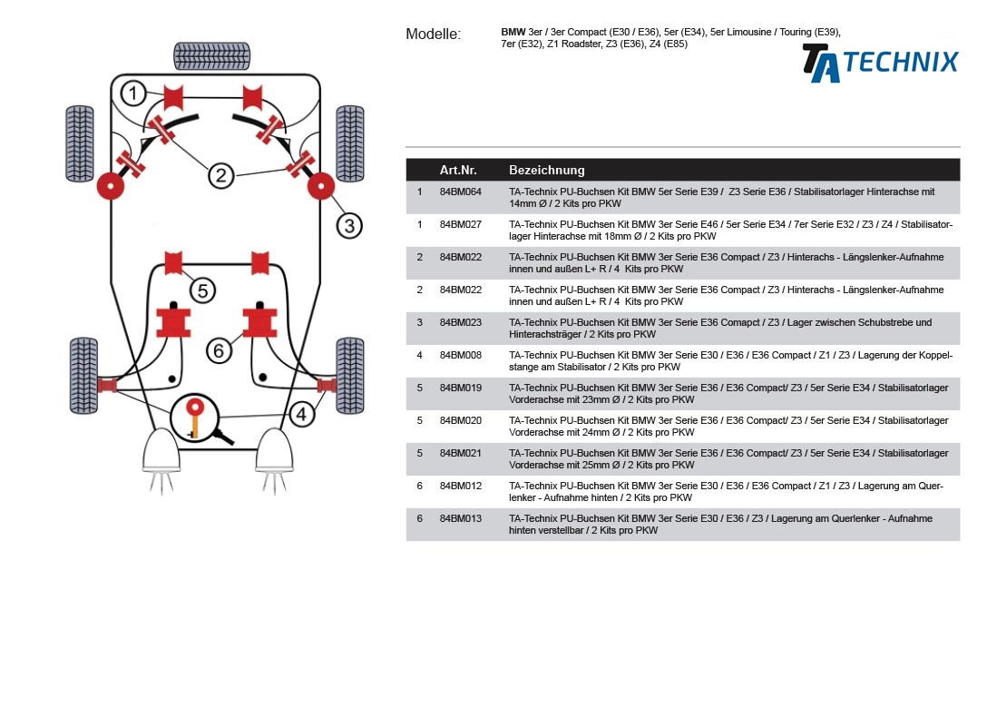 PU-bøsninger fra TA Technix er fremstillet af slidstærkt polyurethan og erstatter de originale gummibøsninger i affjedringen. De giver mere præcis styring og mindre deformation under belastning – ideelle til både sports- og gadebrug.
