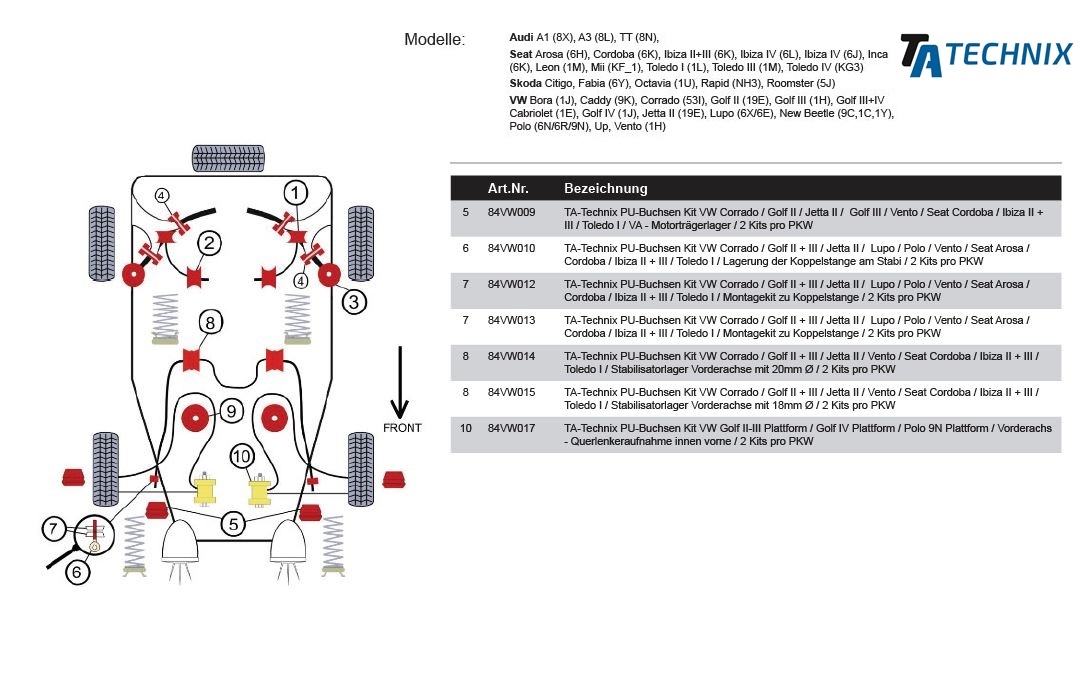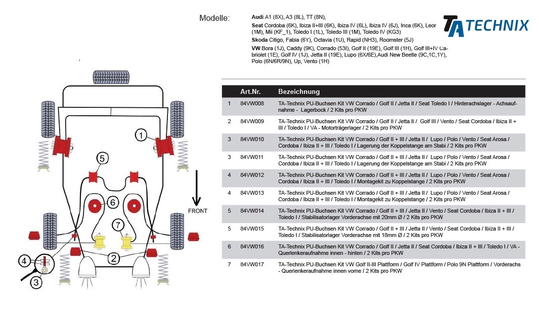 PU-bøsninger fra TA Technix er lavet af slidstærkt polyurethan og erstatter de originale gummibøsninger i ophænget. De giver mere præcis styring og reduceret deformation under belastning – ideel til både sport og gadebrug.