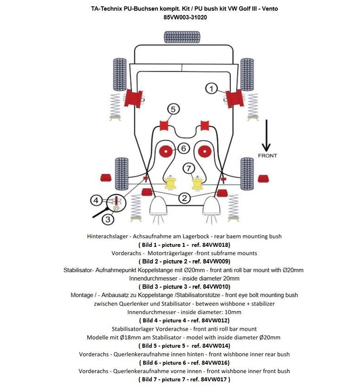 PU bøsninger fra TA Technix er lavet af holdbart polyurethan og erstatter de originale gummibøsninger i affjedringen. De giver mere præcis styring, reduceret deformation under belastning – ideelle til både sport og gadebrug.